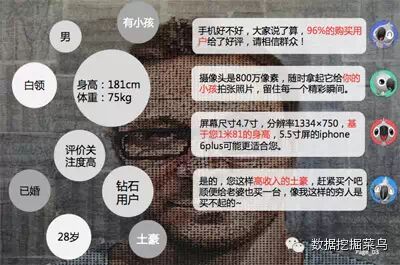用户画像:通过用户各个维度的数据,比如性别、能力、身高,历史浏览记录,购物记录,是不是有小孩,最近购物倾向是什么,关注什么商品,对用户做很细的刻度,分成很多维度的画像,标注土豪还是屌丝,用户价值维度是高是低还是中等,用户是什么类别、性质的,是理性保守型还是购物冲动型的,根据这种细粒度的画像提供个性化的服务。